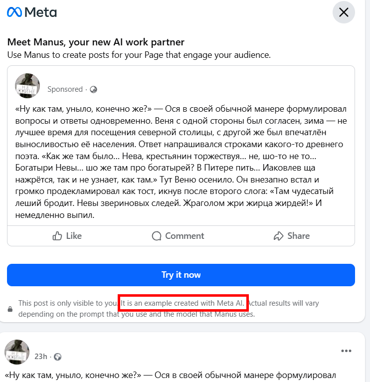 Я как-то снисходительно относился к опасениям того, что ИИ нас всех сейчас заменит. Мол, уж я-то всяко умней и на мой век мне своего интеллекта хватит, но такой наглости, признаюсь, не ожидал. Фейсбук на голубом глазу взял мой вчерашний пост и написал, что это пример того, как какая-то Мета поработала. Ой, в слове «поработила» у меня, кажется, опечатка. Манус, как правильно пишется?